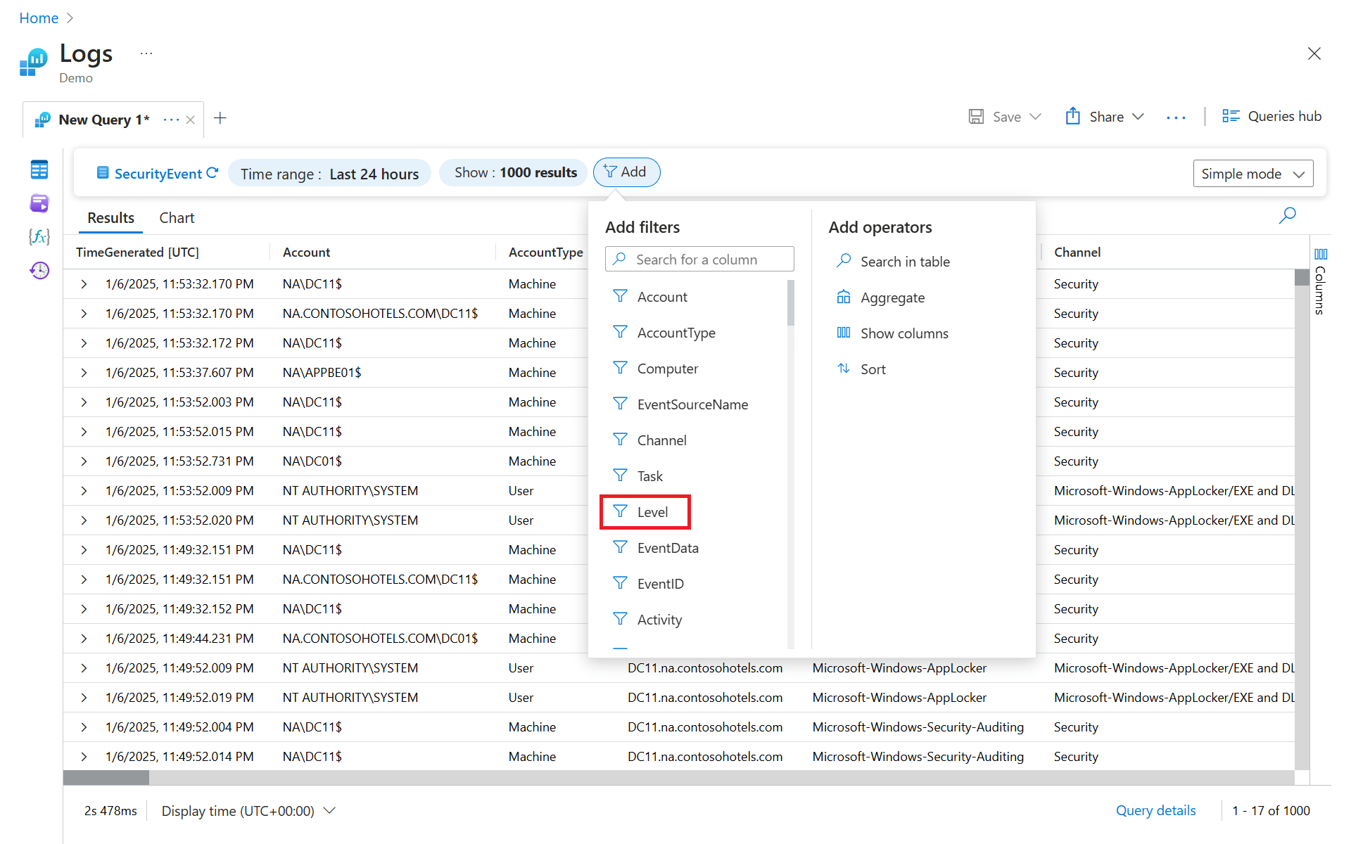 To add a filter to a query, use the where operator followed by one or more conditions. For example, the following query returns only SecurityEvent records where Level equals _8: