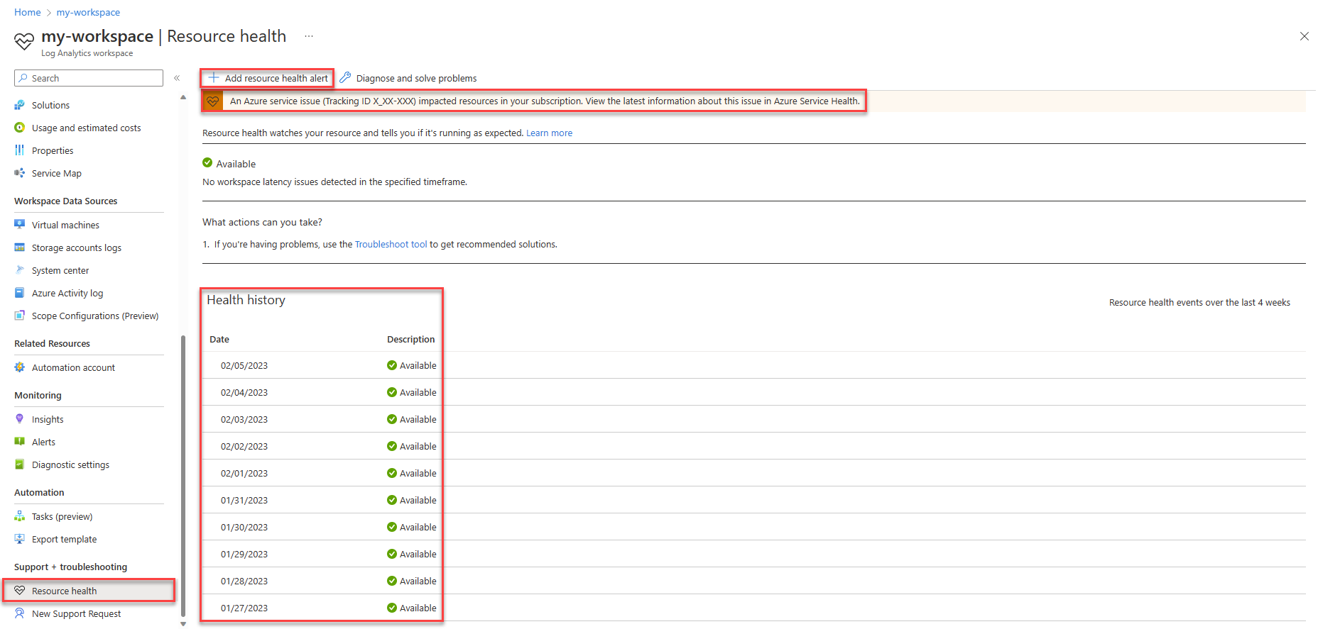 - Resource health: information about the health of your individual cloud resources, such as a specific Log Analytics workspace.