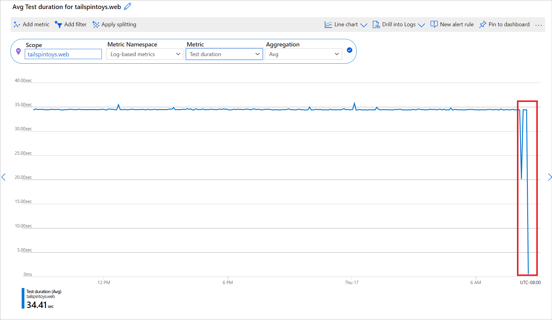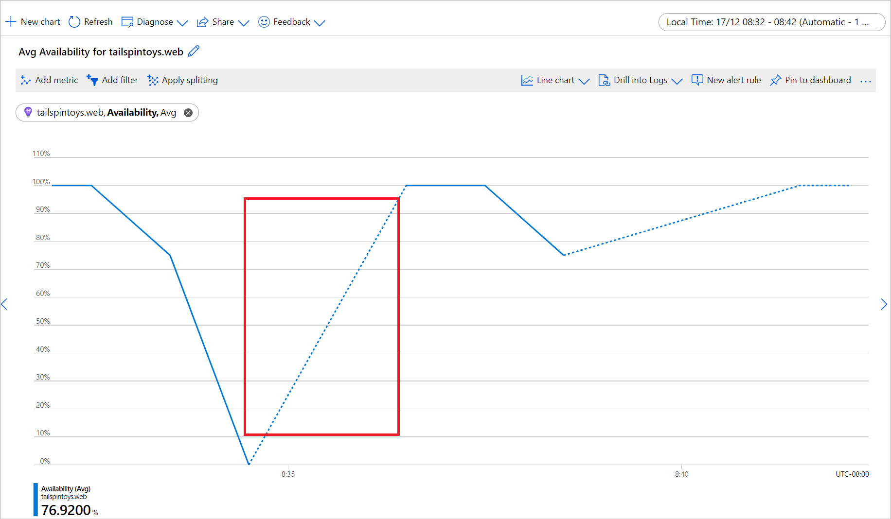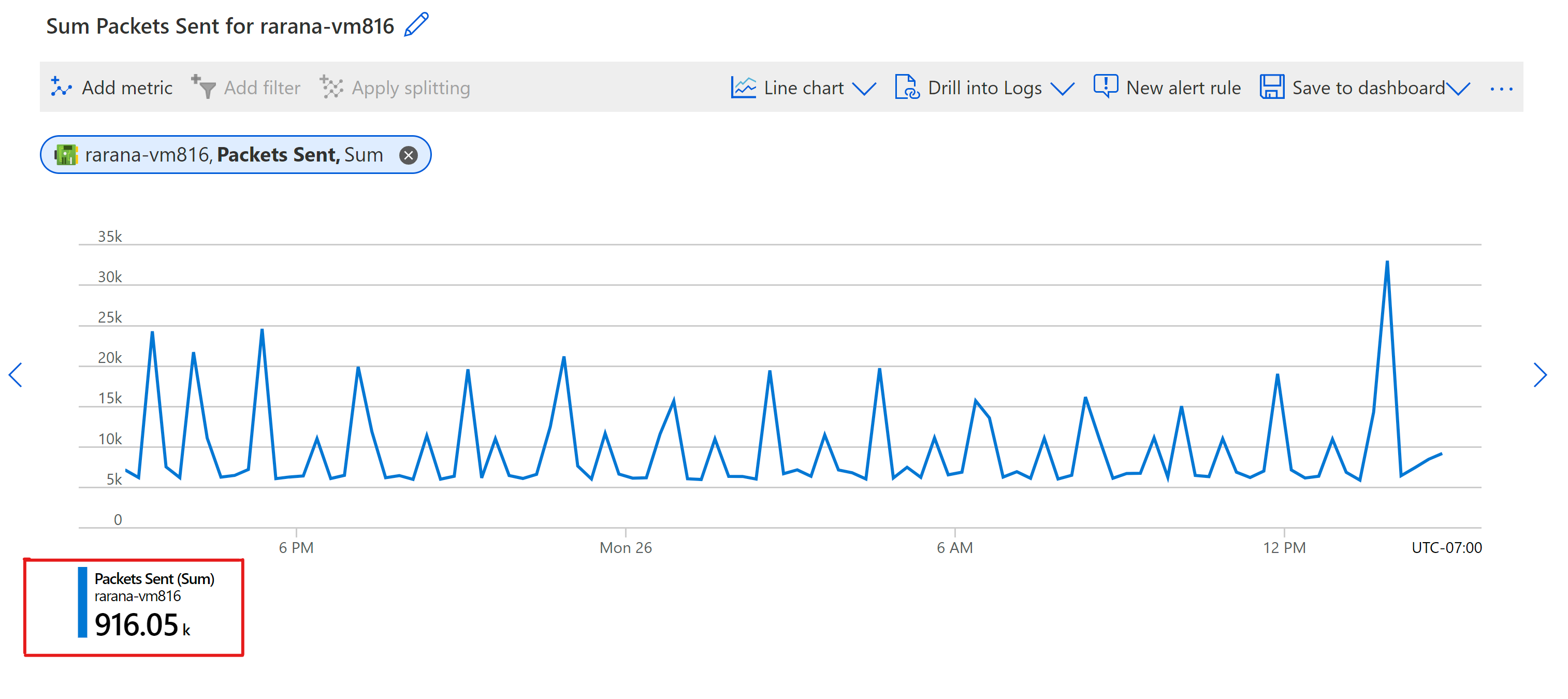 Azure metrics charts use dashed line style to indicate that there's a missing value (also known as "null value") between two known time grain data points. For example, if in the time selector you picked "1 minute" time granularity but the metric was reported at 07:26, 07:27, 07:29, and 07:30 (note a minute gap between second and third data points), then a dashed line connects 07:27 and 07:29 and a solid line connects all other data points. The dashed line drops down to zero when the metric uses count and sum aggregation. For the avg, min or max aggregations, the dashed line connects two nearest known data points. Also, when the data is missing on the rightmost or leftmost side of the chart, the dashed line expands to the direction of the missing data point.