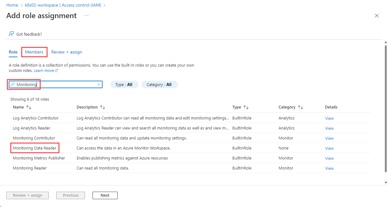 Open your Azure Monitor workspace in the Azure portal and select Access control (IAM).