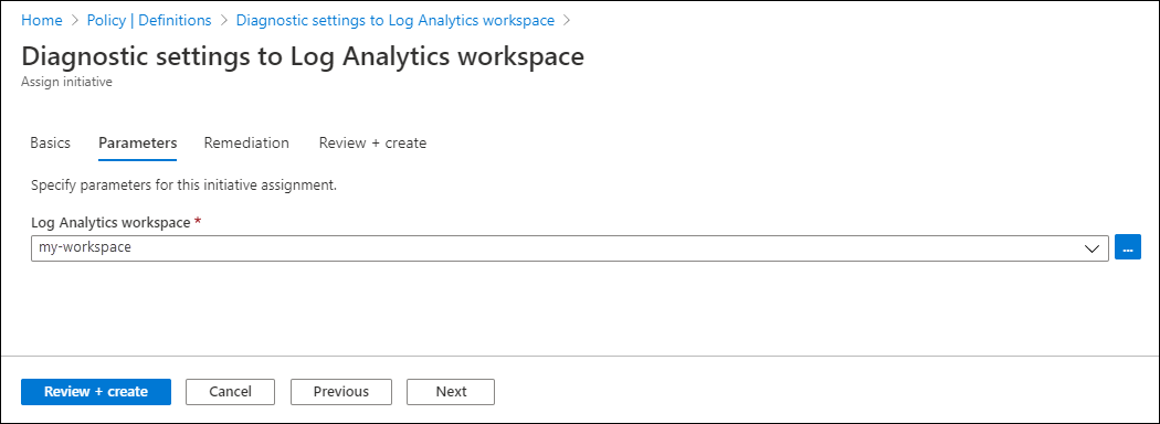 - Instead of specifying the details for the Log Analytics workspace and the event hub for policy definitions included in the initiative, use a common initiative parameter. This parameter allows you to easily specify a common value for all policy definitions and change that value if necessary.