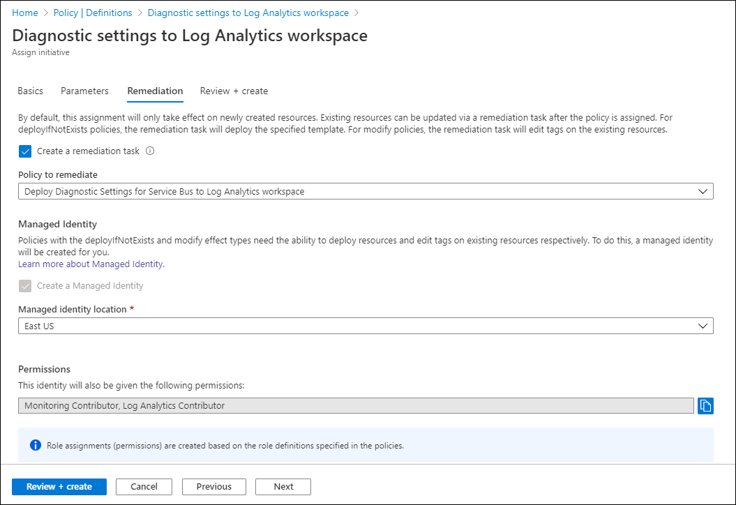 The initiative is applied to each virtual machine as it's created. A remediation task deploys the policy definitions in the initiative to existing resources, so you can create diagnostic settings for any resources that were already created.