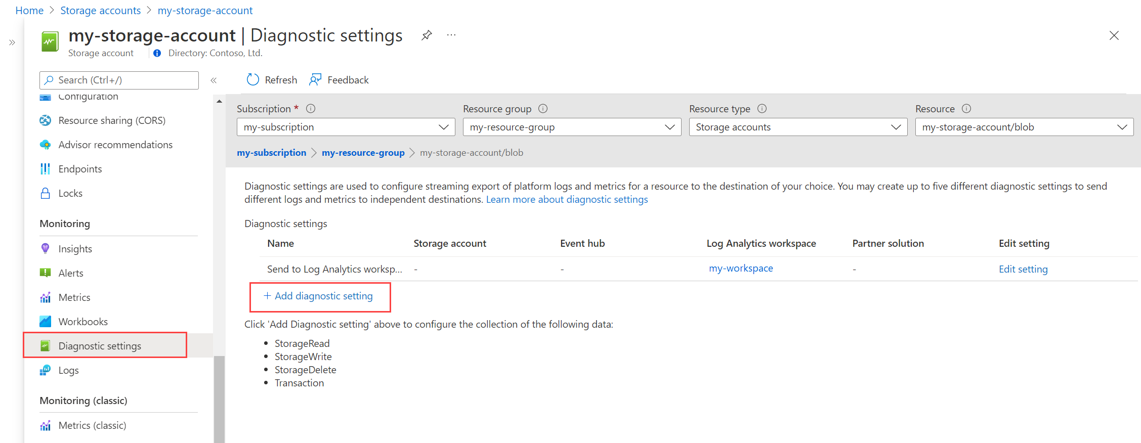 Some resources might require other selections. For example, a storage account requires you to select a resource before the Add diagnostic setting option is displayed. You might also notice a Preview label for some resources because their diagnostic settings are currently in preview.