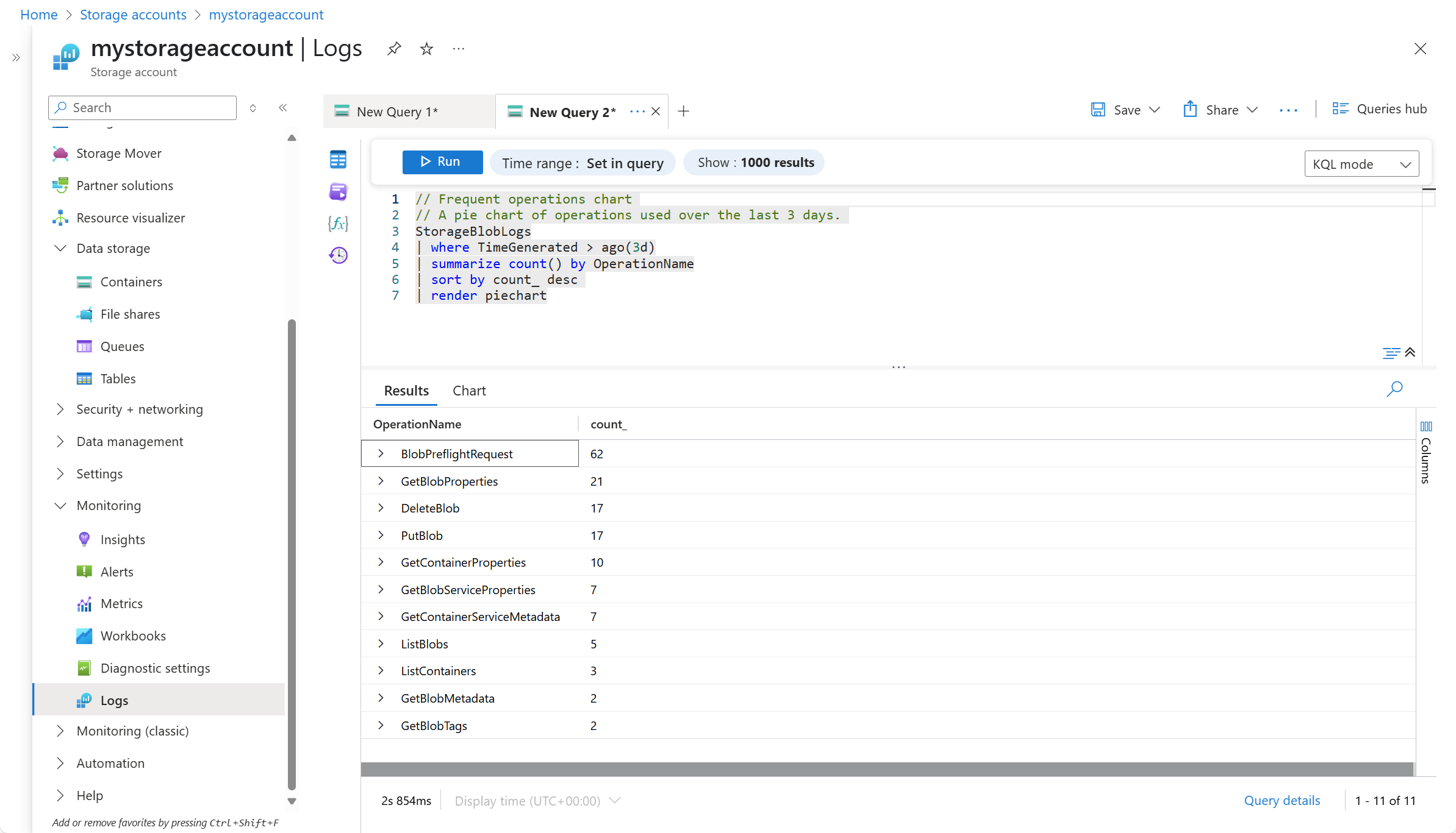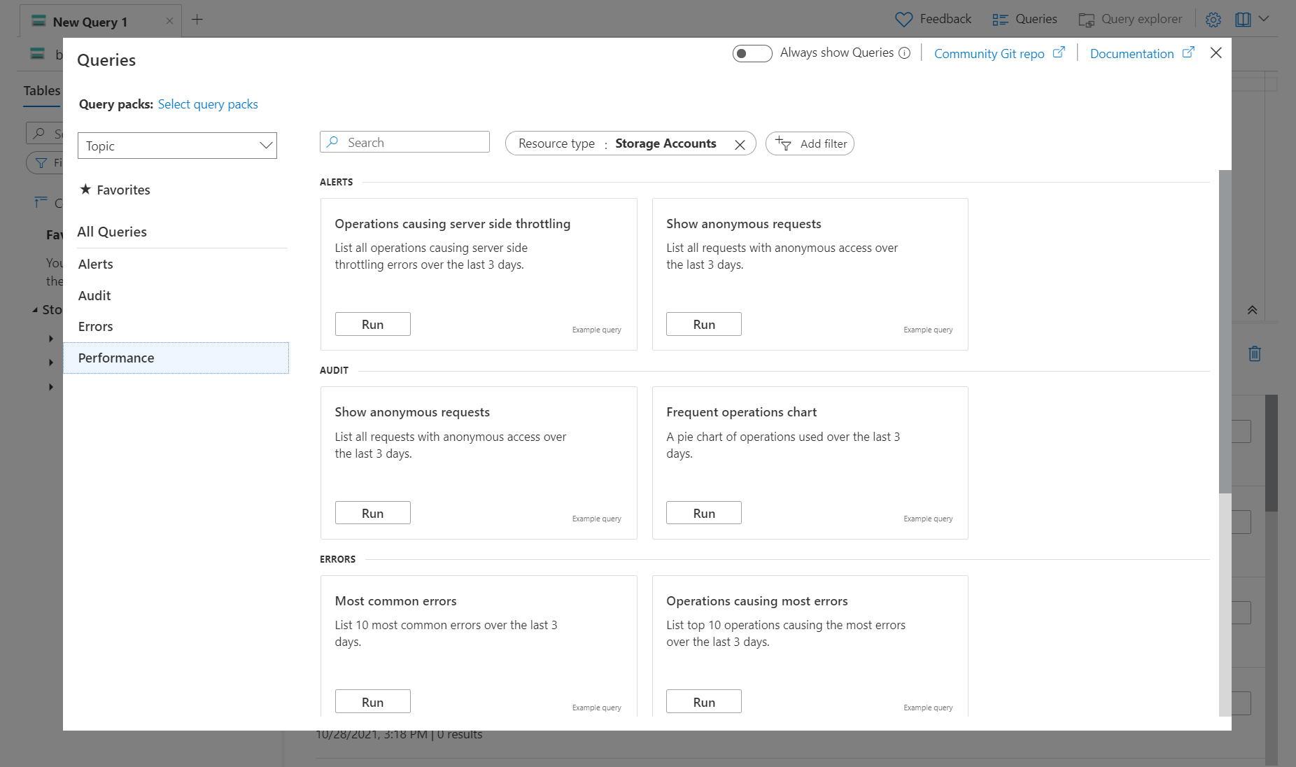 Select Logs from your resource's menu. Log Analytics opens with the Queries hub window that includes prebuilt queries for your resource type.