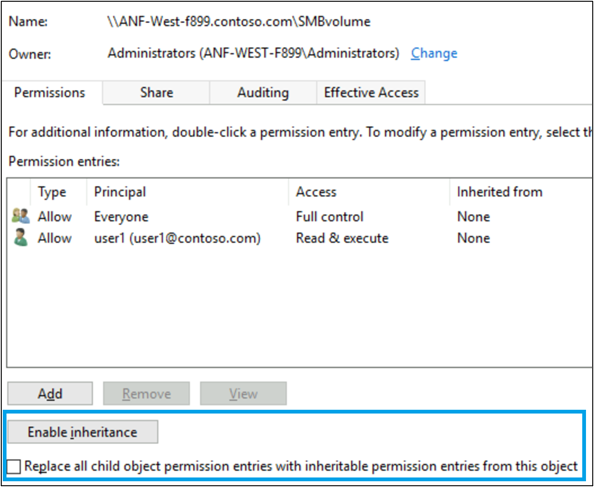 - In Windows SMB shares, inheritance is controlled in the advanced permission view.