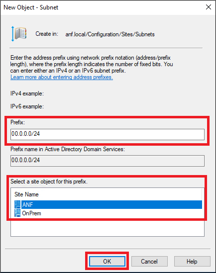 If they aren't assigned, create the subnet object that maps to the AD DS subnet in the Azure virtual network. Right-click the Subnets container in the Active Directory Sites and Services utility and select New Subnet.... In the New Object - Subnet dialog, the 10.0.0.0/24 IP address range for the AD DS Subnet is entered in the Prefix field. Select ANF as the site object for the subnet. Select OK to create the subnet object and assign it to the ANF site.