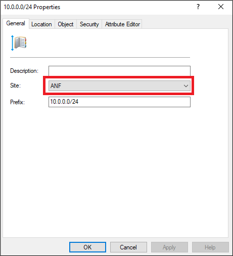 To verify that the new subnet object is assigned to the correct site, right-click the 10.0.0.0/24 subnet object and select Properties. The Site field should show the ANF site object: