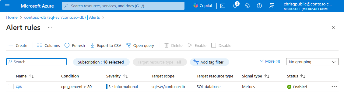 To avoid sprawl of many independent alerts, you may want to configure alerts for all resources of a type in a subscription, resource group, or an Azure SQL Database logical server. Use the Scope tab to change the scope of the new alert rule.