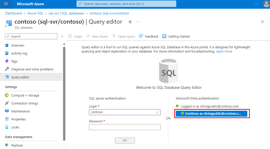 Setting Suggested value Description Server type Database engine This value is required. Server name The fully qualified Azure SQL Database logical server name For example, your_logical_azure_sql_server.database.windows.net.Authentication SQL Server Authentication Use SQL Server Authentication to enter a user name and password. Microsoft Entra authentication To connect using Microsoft Entra ID, if you're the Microsoft Entra server admin, choose Microsoft Entra MFA. For more information, see Configure and manage Microsoft Entra authentication with Azure SQL. Login The server admin account If using SQL Server Authentication, the account that you specified when you created the server. Password The password for your server admin account If using SQL Server Authentication, the password that you specified when you created the server.