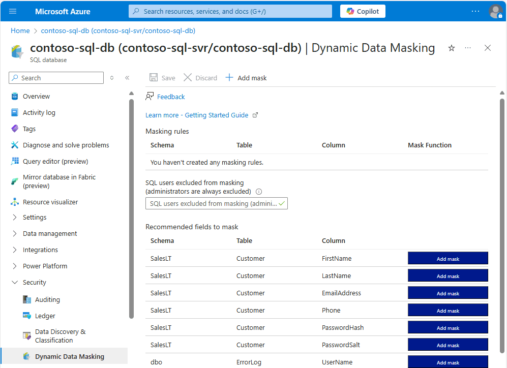 AdventureWorksLTdatabase.To add a mask for any column in your database, at the top of the Dynamic Data Masking configuration page, select Add Mask to open the Add Masking Rule configuration page.