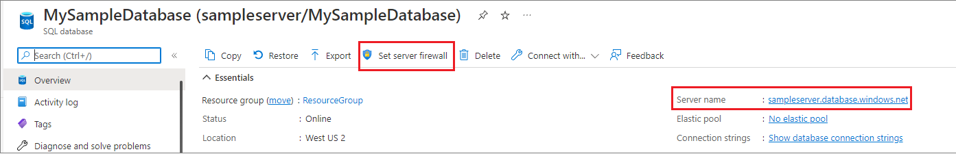After the database deployment completes, select SQL databases from the left-hand menu and then select mySampleDatabase on the SQL databases page. The overview page for your database opens. It displays the fully qualified server name (such as sampleserver.database.windows.net) and provides options for further configuration. You can also find the firewall settings by navigating directly to your server, and selecting Networking under Security.