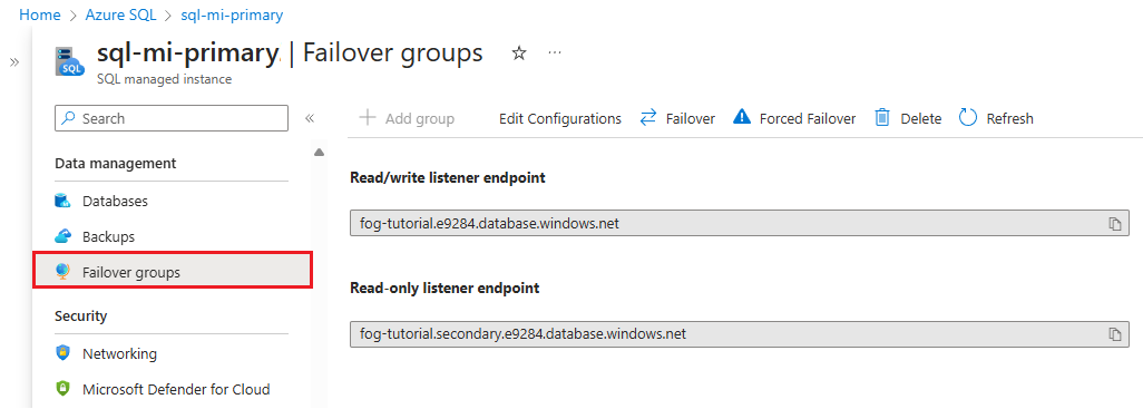 To locate the listener endpoint in the Azure portal, go to your SQL managed instance and under Data management, select Failover groups.