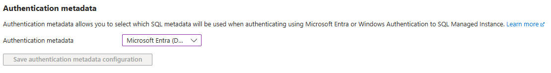 - Microsoft Entra (Default): This mode allows authenticating Microsoft Entra users using Microsoft Entra user metadata. In order to use Windows authentication in this mode, see What is Windows Authentication for Microsoft Entra principals on Azure SQL Managed Instance?