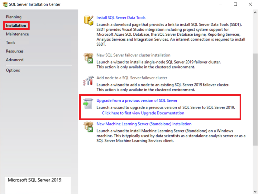 Setup.exefrom the SQL Server installation media.The Installation Wizard starts the SQL Server Installation Center. To upgrade an existing instance of SQL Server, select Installation on the navigation pane, and then select Upgrade from an earlier version of SQL Server.