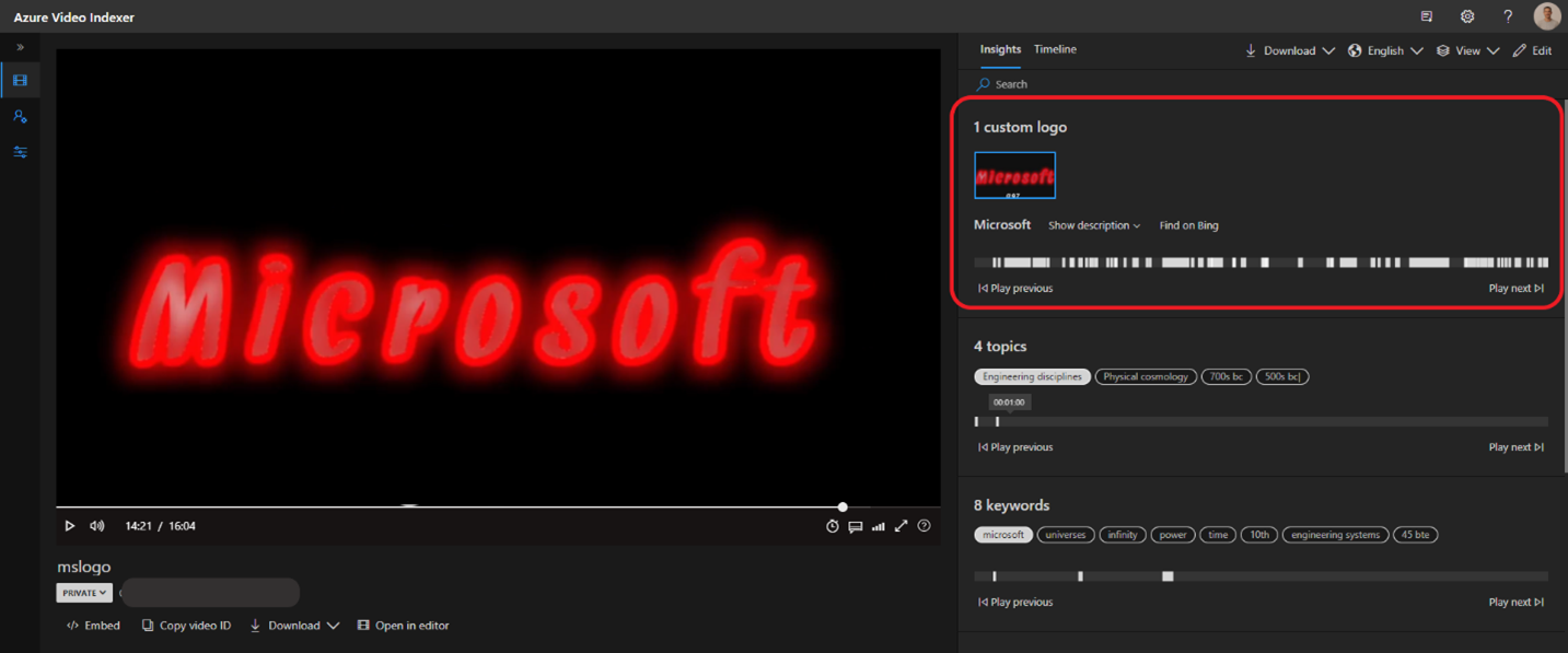Assuming the textual logo model finds a match, you're able to view the result in the Azure AI Video Indexer website.