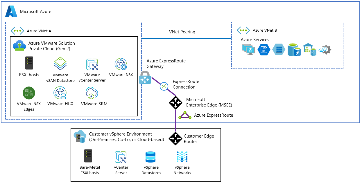 - Azure VMware Solution Gen 2 private clouds are now deployed inside an Azure Virtual Network by default, providing instant connectivity to other Azure services.