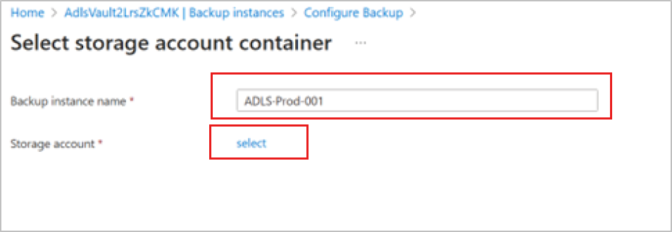 On the Select storage account container pane, provide the Backup instance name, and then click select under Storage account.