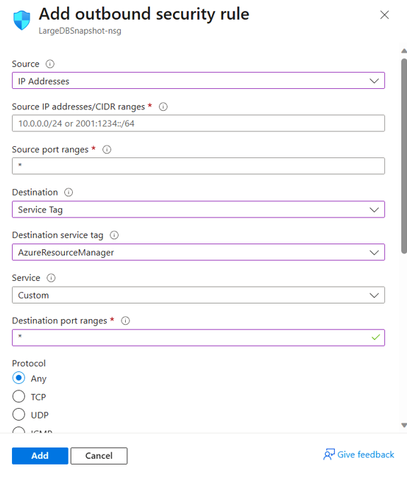 Select Add. Enter all the required details for creating a new rule as described in security rule settings. Ensure the option Destination is set to Service Tag and Destination service tag is set to AzureBackup.