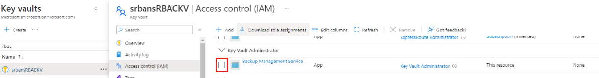 To enable backups for ADE-encrypted VMs by using key vaults that are enabled by Azure role-based access control (RBAC), assign the Key Vault Administrator role to the Backup Management Service Microsoft Entra app by adding a role assignment on Access control for the key vault.