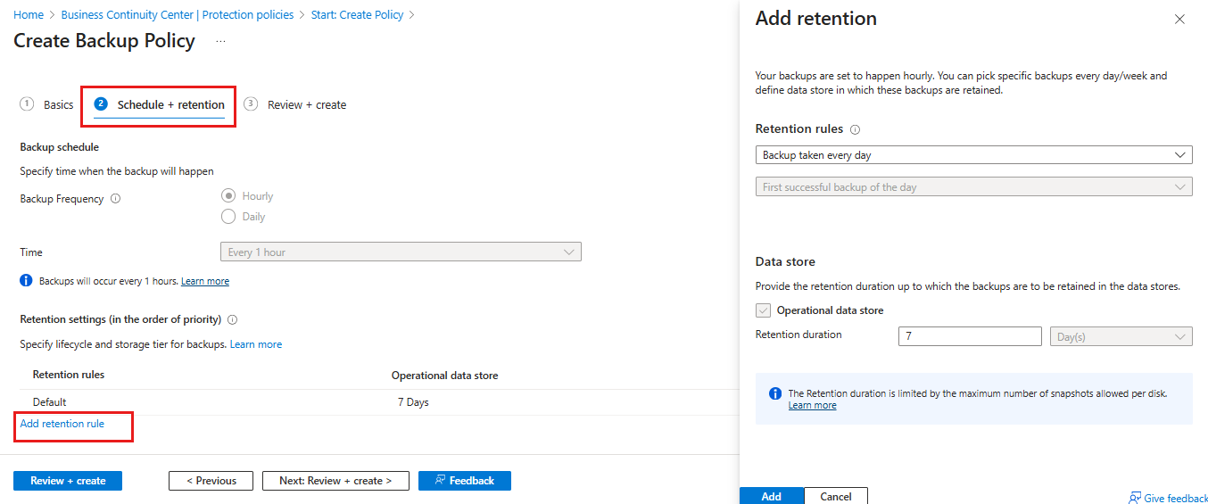 Under Retention rules, select retention settings that meet the recovery point objective (RPO) requirement.