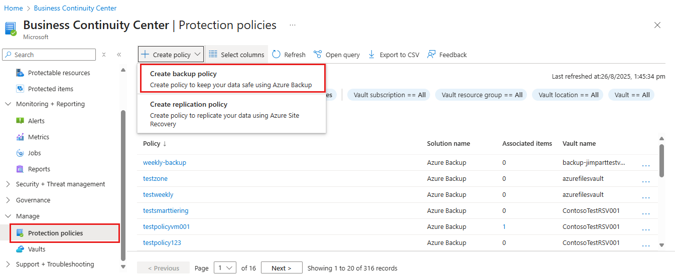 Go to Business Continuity Center, and then select Manage > Protection policies.