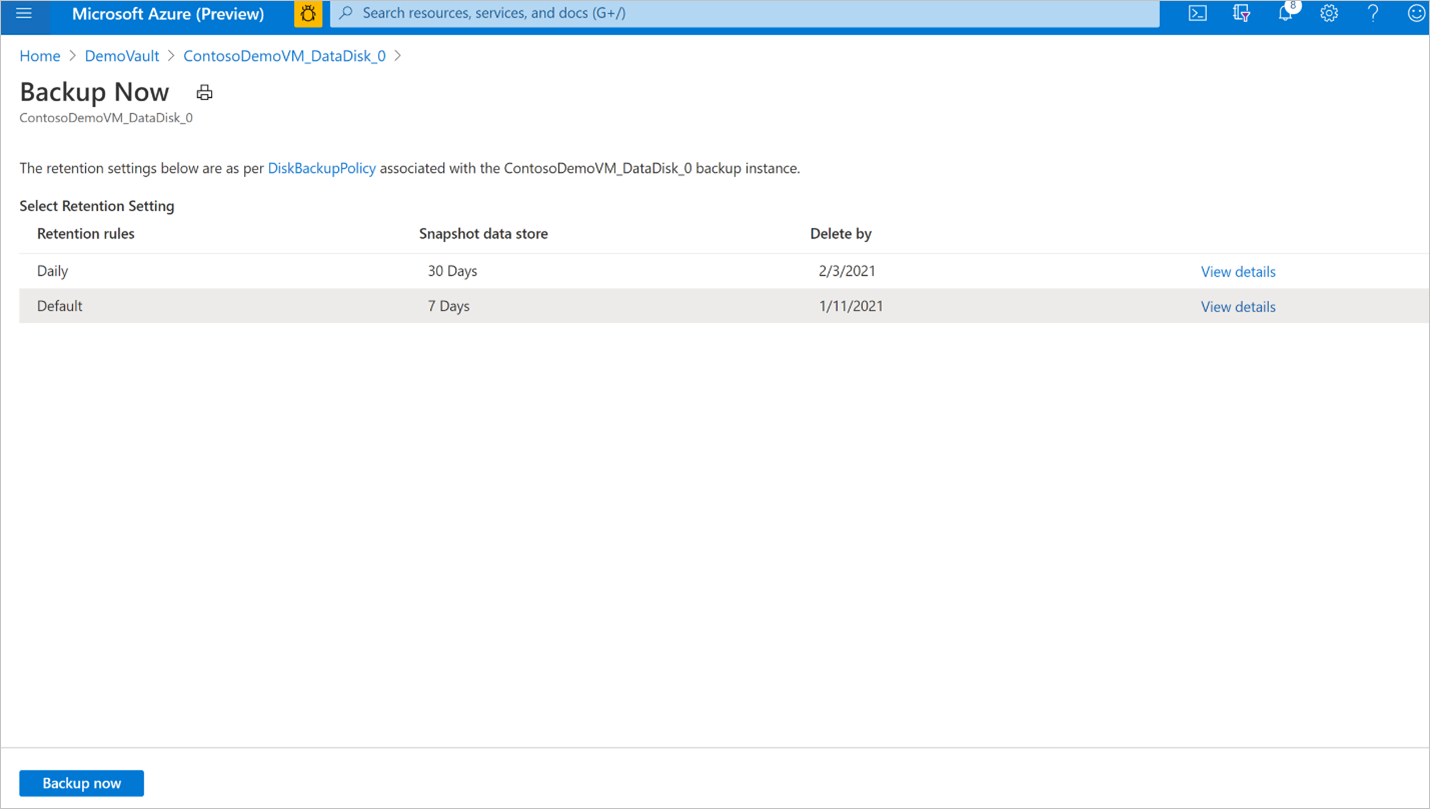 Select one of the retention rules associated with the backup policy. This retention rule determines the retention duration of this on-demand backup. Select Backup now to start the backup.