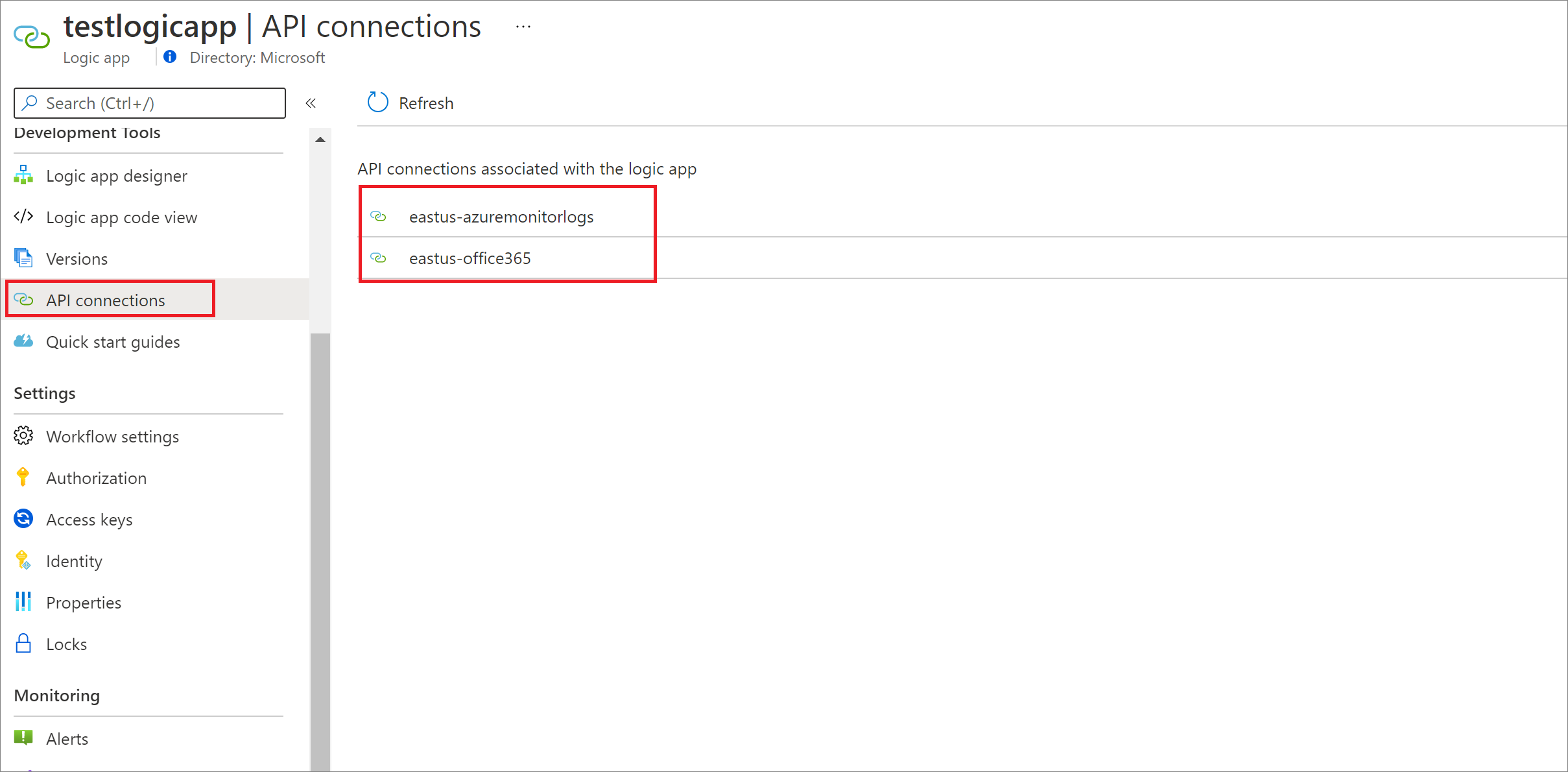 <location>-azuremonitorlogsand<location>-office365- that is, eastus-azuremonitorlogs and eastus-office365.Go to each of these connections and select the Edit API connection menu item. In the screen that appears, select Authorize, and save the connection once authorization is complete.