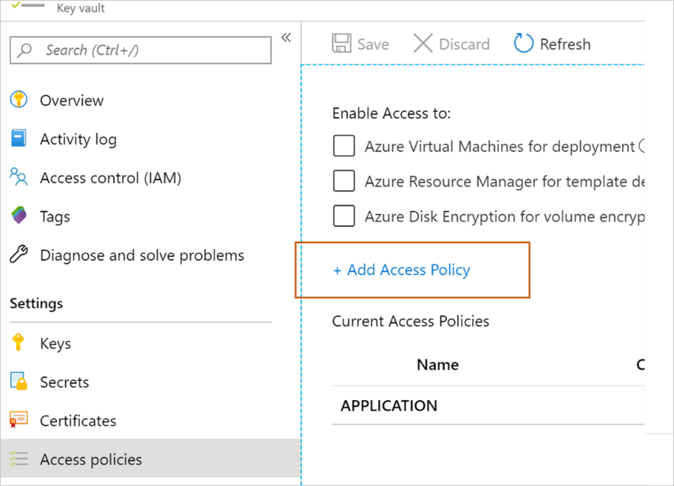 1. Go to your key vault > Access policies. Select +Add Access Policy.