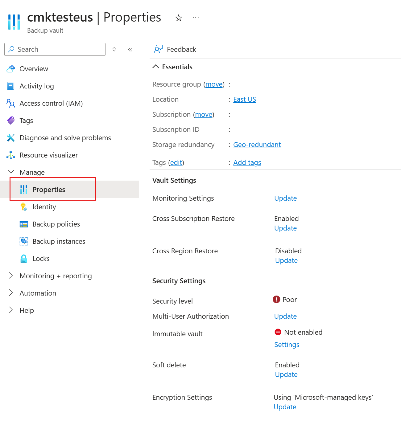 • Moving a CMK-encrypted Recovery Services vault across resource groups and subscriptions isn't currently supported.