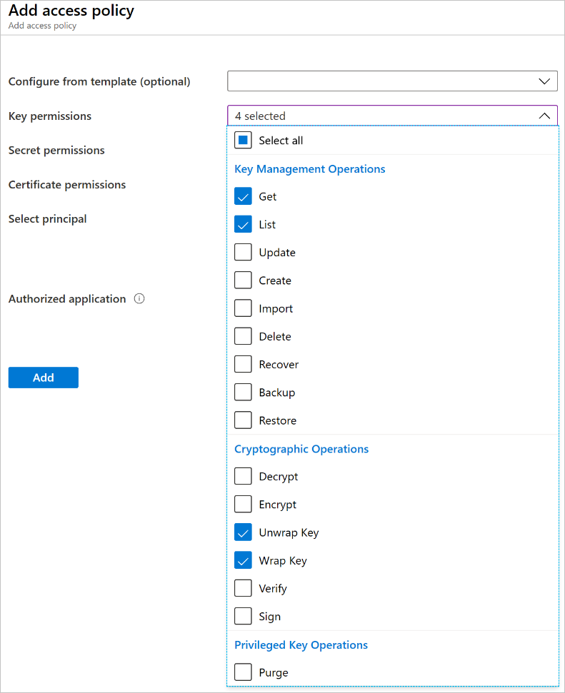 2. Specify the actions to permit on the key. For Key permissions, select the Get, List, Unwrap Key, and Wrap Key operations.