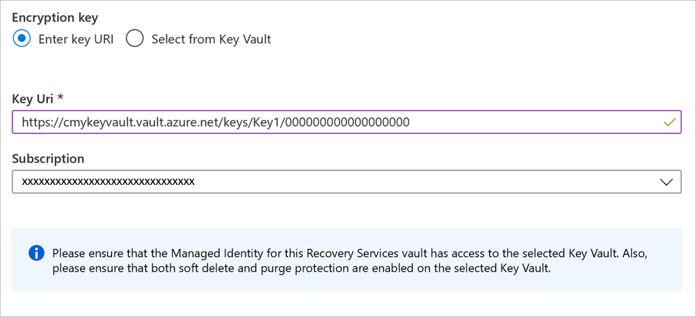 • Select Enter key URI. In the Key Uri box, enter the URI for the key that you want to use for encrypting data in this Recovery Services vault. You can also get this key URI from the corresponding key in your key vault. In the Subscription box, specify the subscription for the key vault that contains this key.
