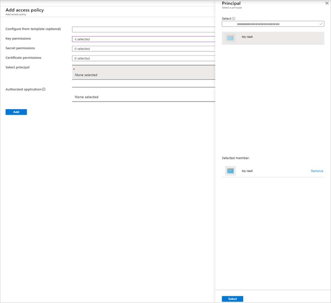 3. Go to Select principal and search for your vault in the search box by using its name or managed identity. When the vault appears, select it and then choose Select at the bottom of the panel.