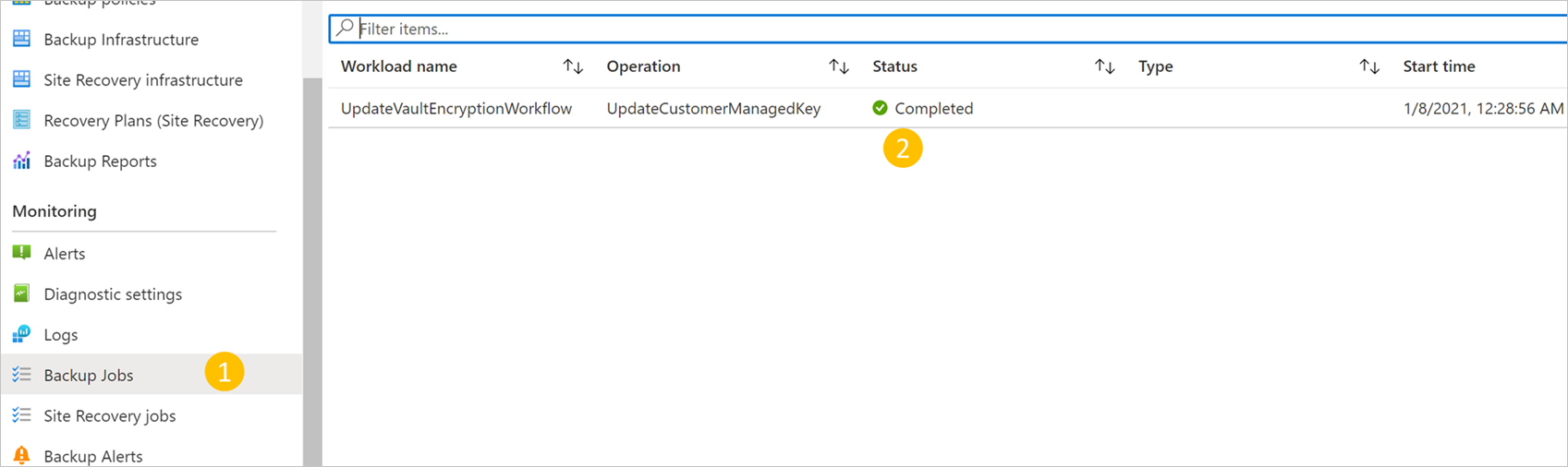 5. Track the progress and status of the encryption key assignment by using the Backup Jobs view on the left menu. The status should soon change to Completed. Your vault will now encrypt all the data with the specified key as a KEK.