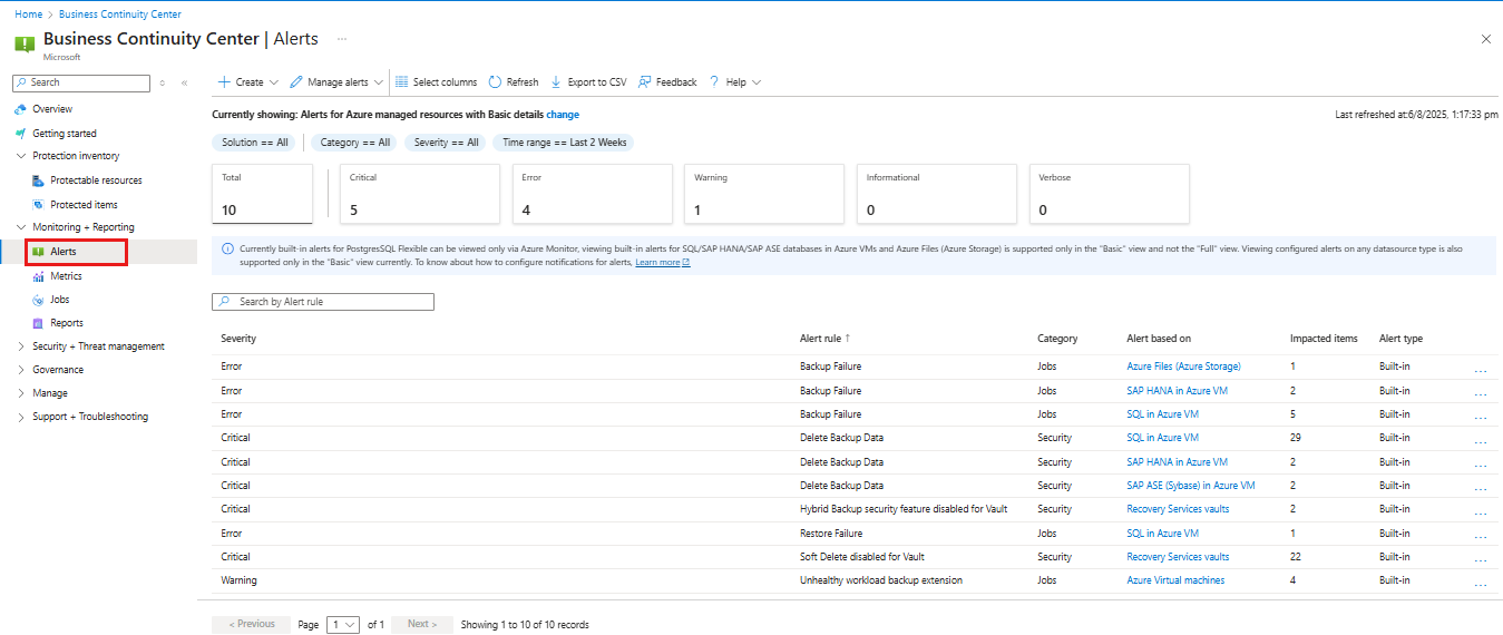 In the Azure portal, go to Business Continuity Center select Monitoring + Reporting > Alerts.