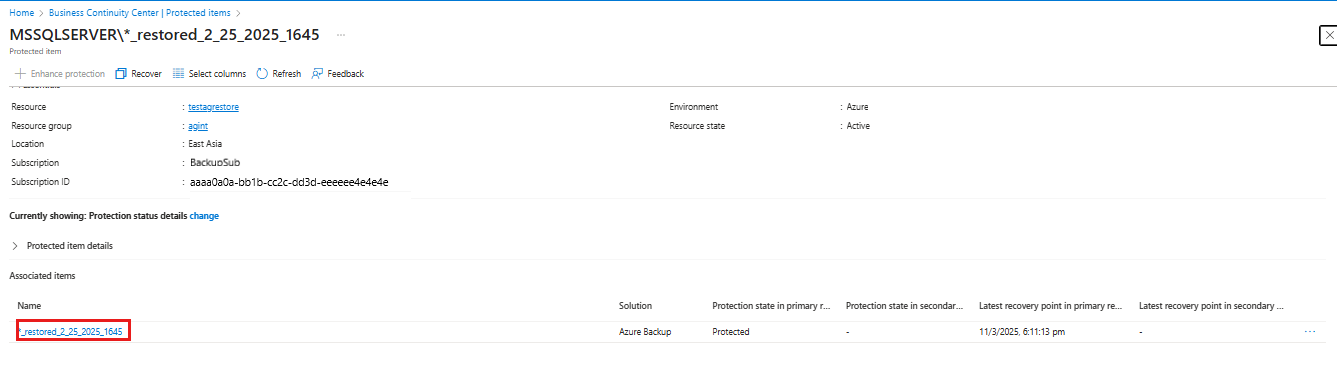Go to Business Continuity Center and select Protection inventory > Protected items.