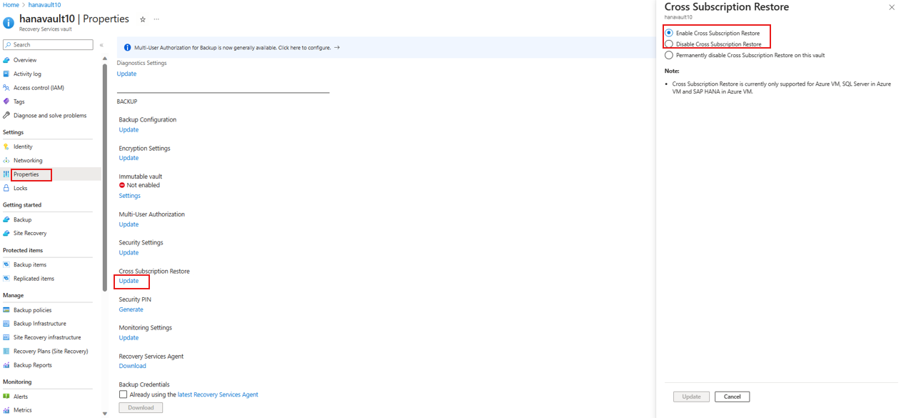 By default, CSR is enabled on the Recovery Services vault. To update the Recovery Services vault restore settings, go to Properties > Cross Subscription Restore and make the required changes.