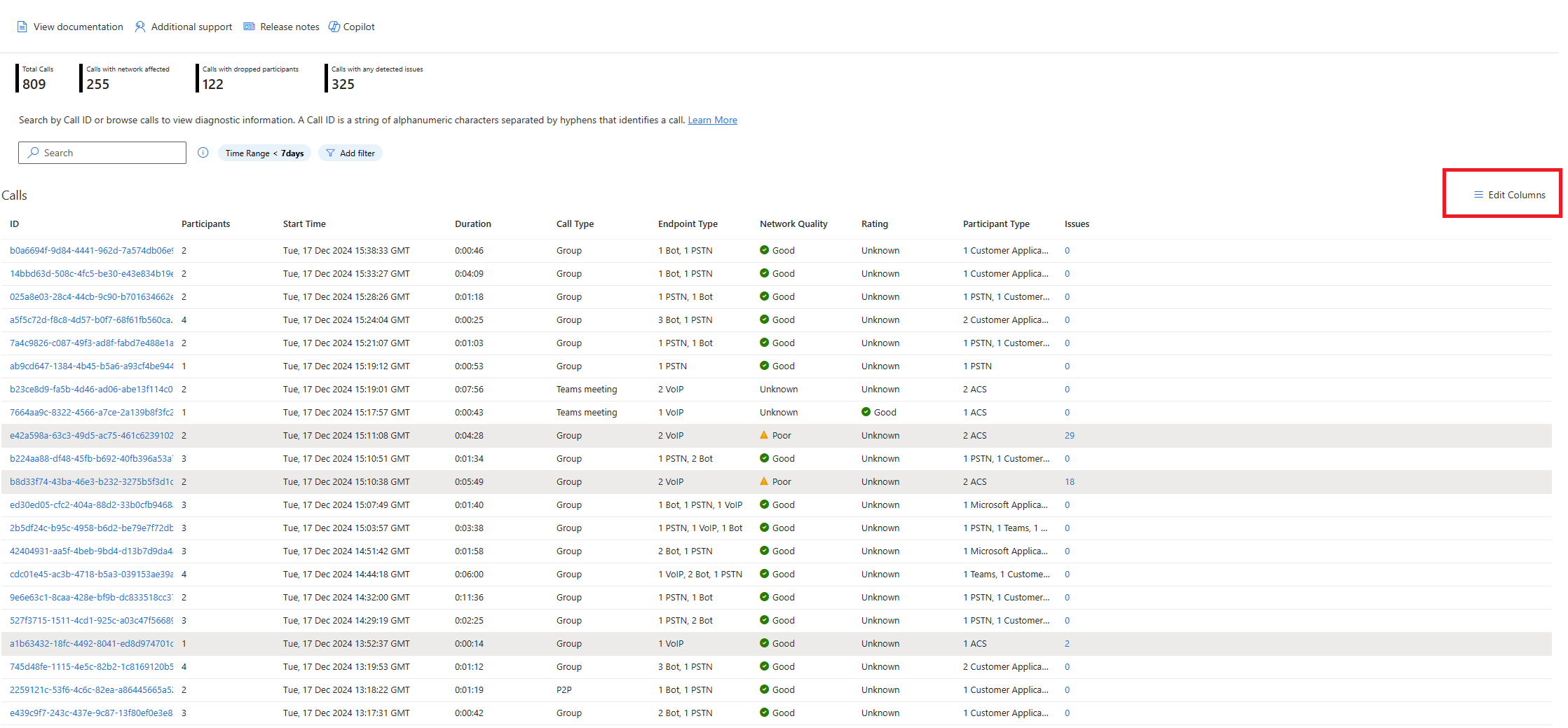 Since Call Diagnostics is an application layer on top of data for your Azure Communications Services resource, you can query the call data and build workbook reports on top of your data.