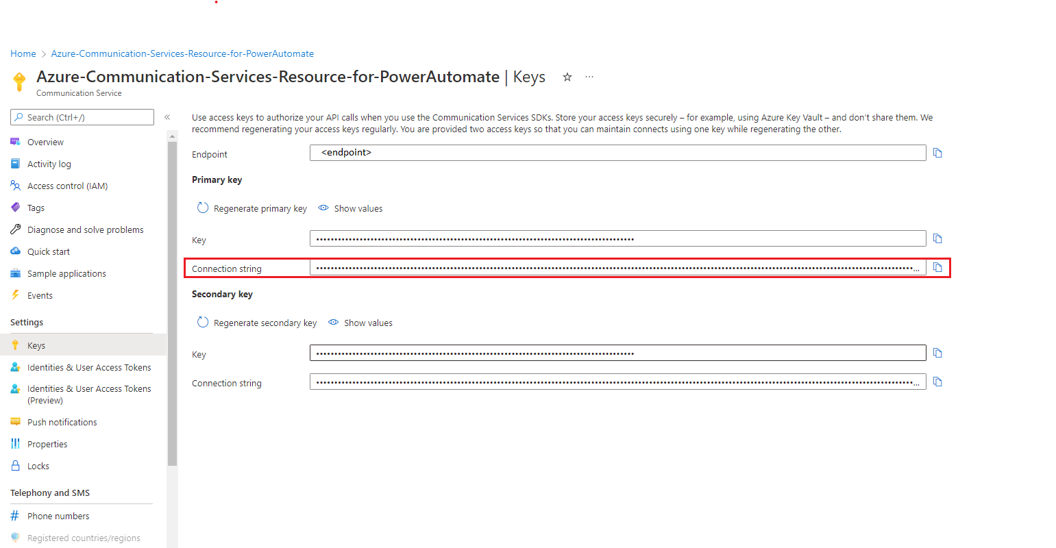 3. Enter the connection string for your Azure Communications Service resource. To find this string, follow these steps: