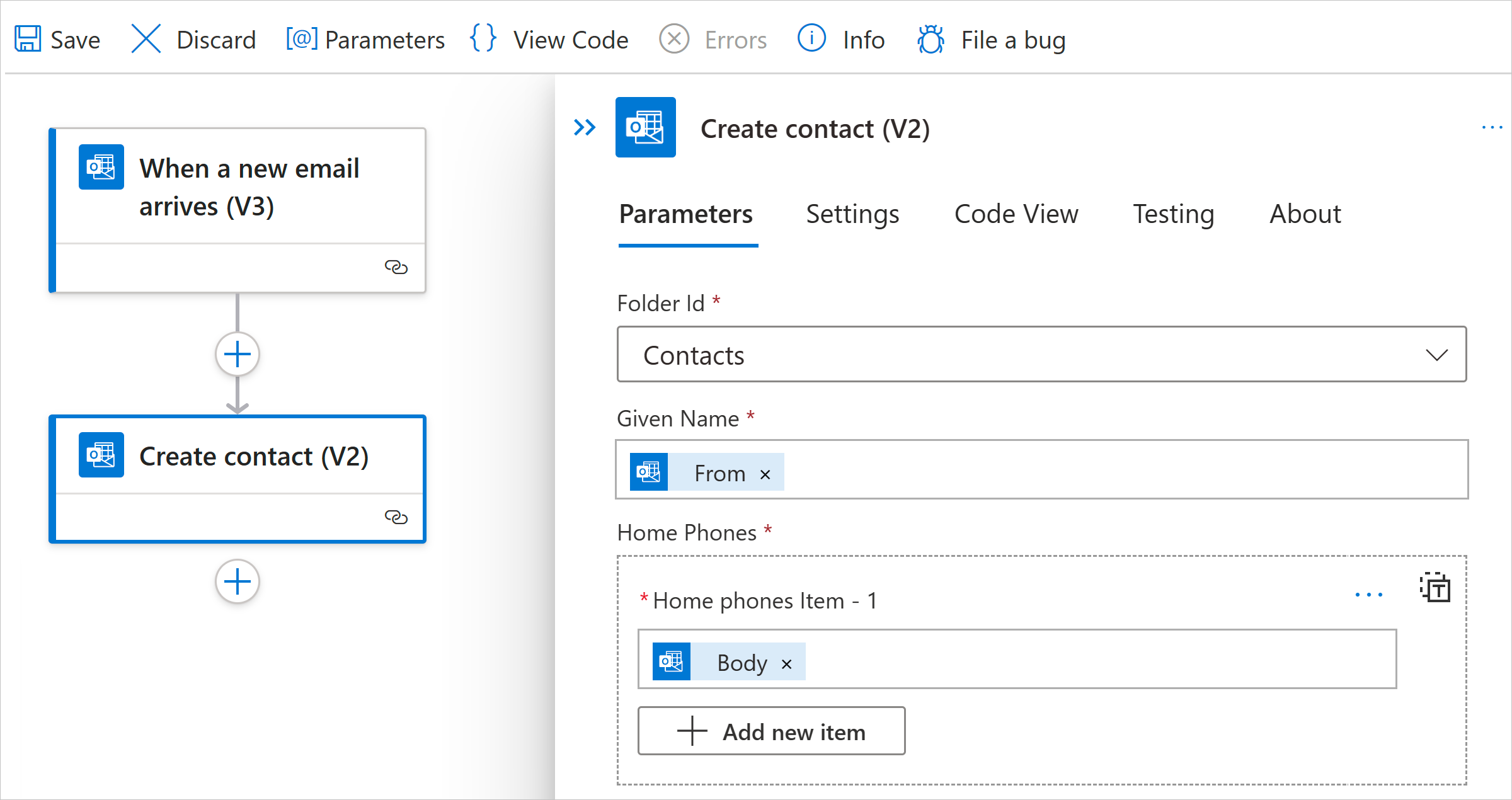 Parameter Required Value Description Folder Id Yes Contacts The folder where the action creates the new contact Given name Yes <contact-name> The name to give the contact Home phones Yes <home-phone-number> The home phone number for the contact This example selects the Contacts folder where the action creates the new contact and uses trigger outputs for the remaining parameter values: