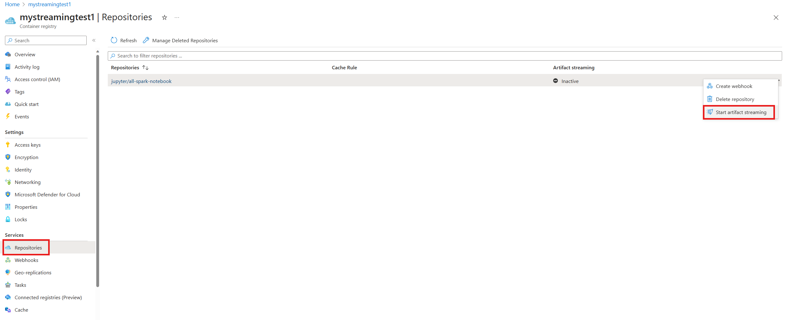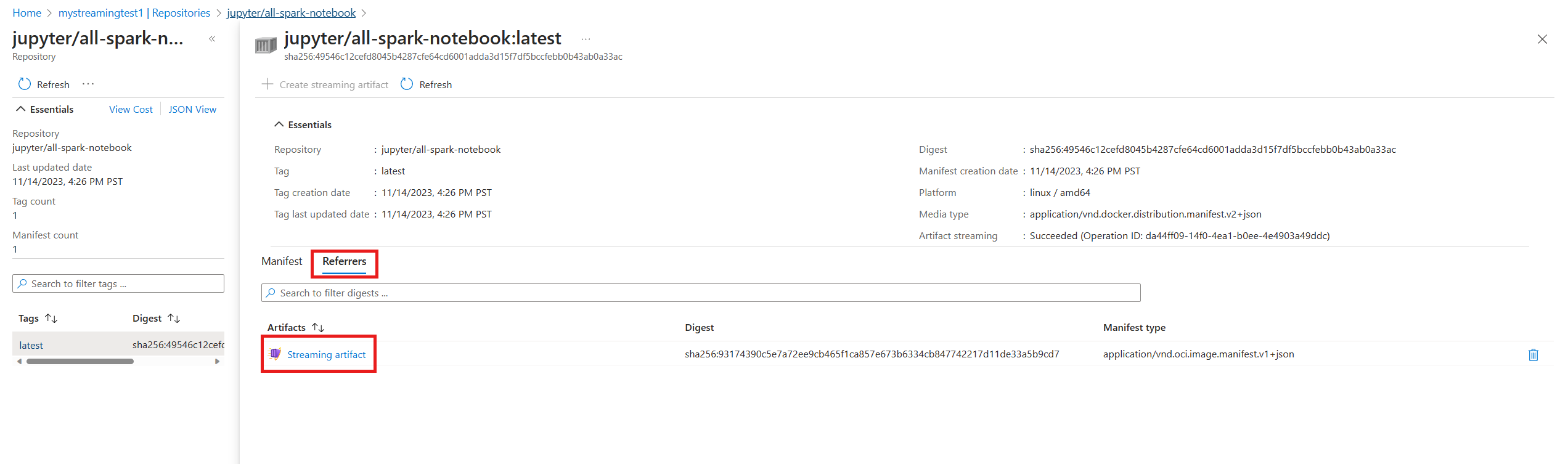 mystreamingtestACR.az configure --defaults acr="mystreamingtest" az acr import --source docker.io/jupyter/all-spark-notebook:latest -t jupyter/all-spark-notebook:latestCreate an artifact streaming from the Image
