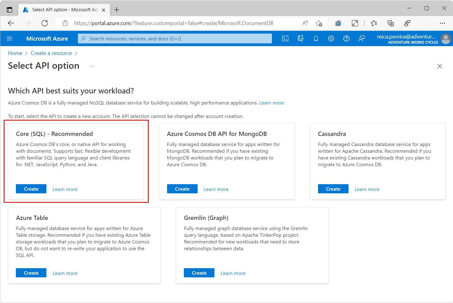 On the Select API option page, select the Create option within the NoSQL - Recommend section. Azure Cosmos DB has five APIs: SQL, MongoDB, Gremlin, Table, and Cassandra. Learn more about the API for NoSQL.