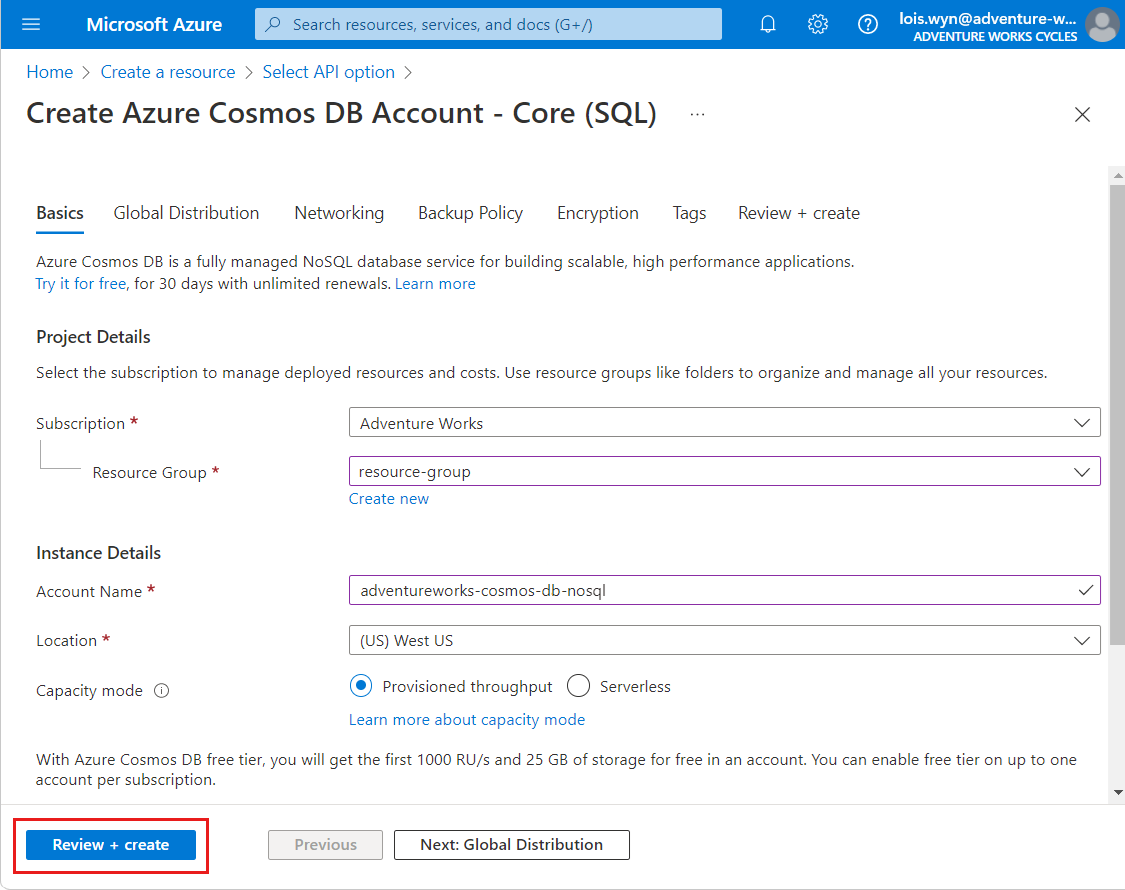With Azure Cosmos DB free tier, you'll get the first 1000 RU/s and 25 GB of storage for free in an account. Learn more about free tier. |