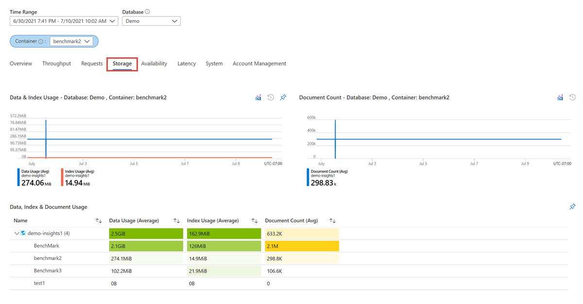 It's important to determine the storage distribution of any partitioned container by data usage, index usage, and document usage. You can minimize the index usage, maximize the data usage, and optimize your queries. To get this data, navigate to the Insights pane and open the Storage tab.