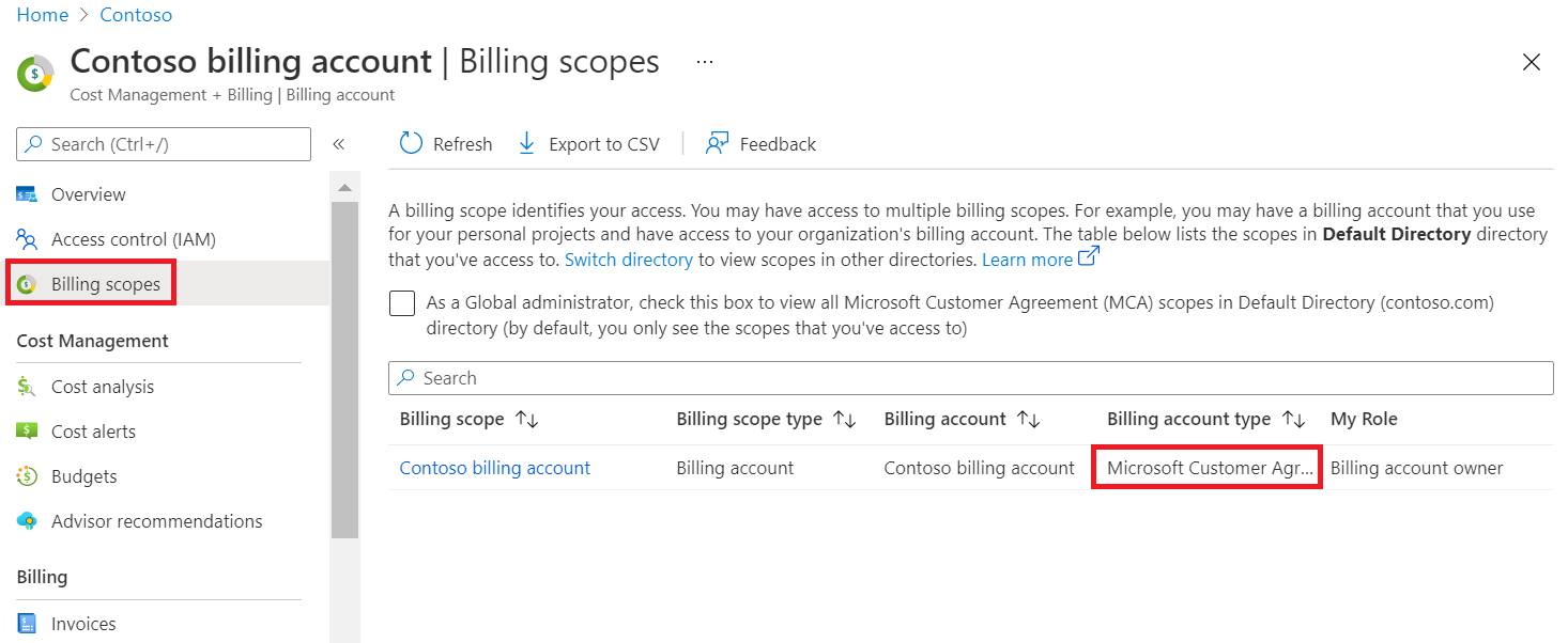 If you have access to multiple billing scopes, check the type in the billing account column. You have access to a billing account for a Microsoft Customer Agreement if the billing account type for any of the scopes is Microsoft Customer Agreement.