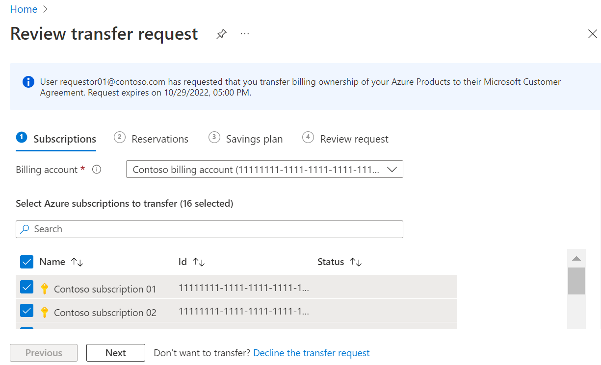 - Warnings - There's a warning for the selected Azure product. While the product can still be transferred, doing so has some consequence that the user should be aware of in case they want to take mitigating actions. For example, the Azure subscription being transferred is benefitting from a reservation. After transfer, the subscription will no longer receive that benefit. To maximize savings, ensure that the reservation is associated to another subscription that can use its benefits. Instead, the user can also choose to go back to the selection page and unselect this Azure subscription. Select Check details for more information.