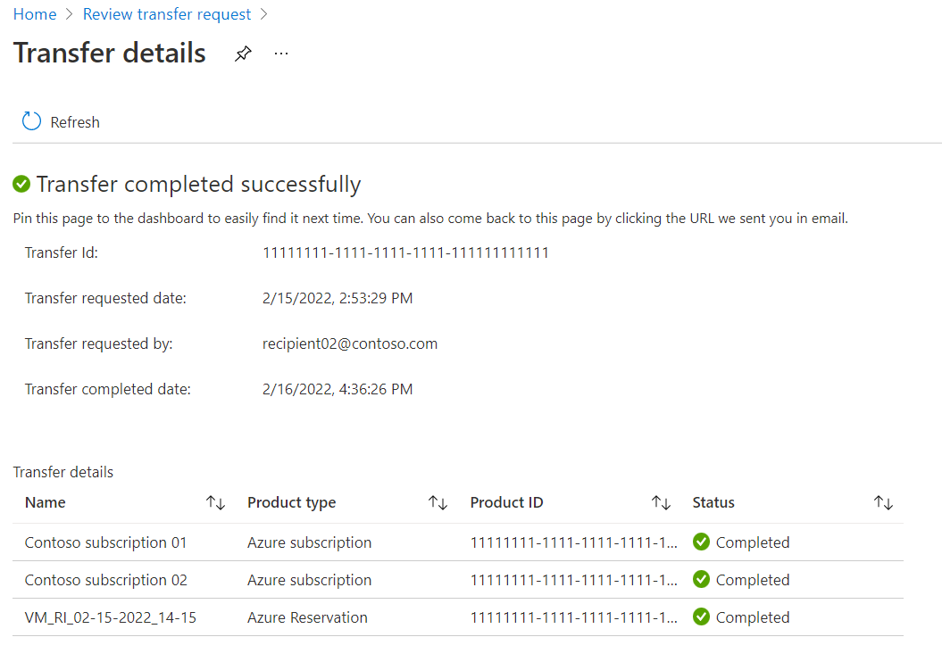 - Failed - The selected Azure product can't be transferred because of an error. The user needs to go back to the selection page and unselect this product to transfer the other selected Azure products.
