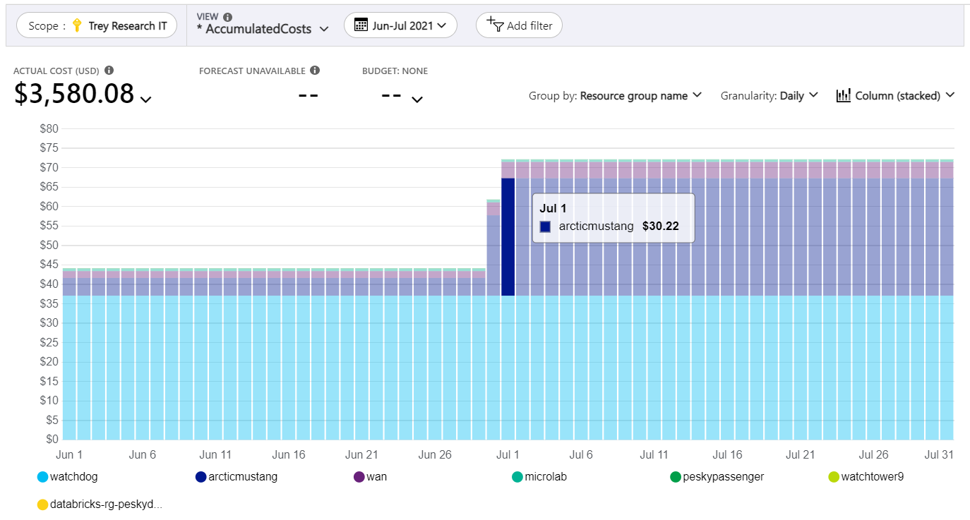 So far, we found an increase in cost for the articmustang resource group at the end of June and the beginning of July. You might notice that the cost increase spanned over two days. The change took two days because a change in the middle of a day doesn't show the full effect of that change until the following full day.