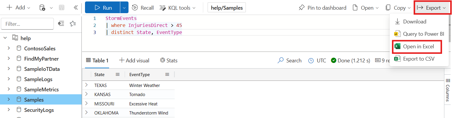 Screenshot that shows Azure Data Explorer web UI query to Open in Excel.