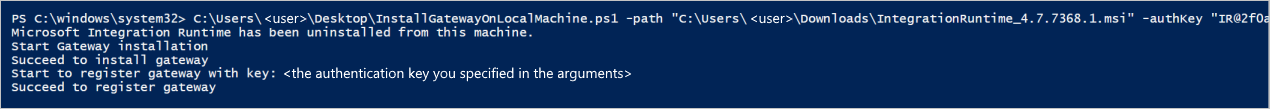 PS C:\windows\system32> C:\Users\username\Desktop\InstallGatewayOnLocalMachine.ps1 -path "C:\Users\username\Downloads\IntegrationRuntime_4.7.7368.1.msi" -authKey "[key]"Note