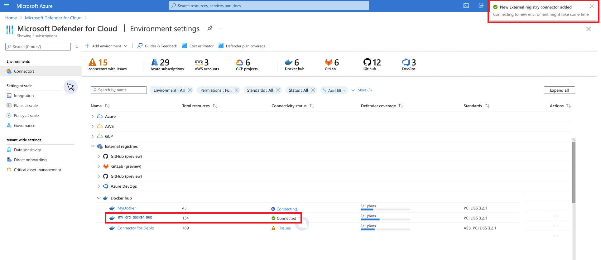 Inventory – Make sure your Docker Hub connector and its security status appear in the Inventory view.